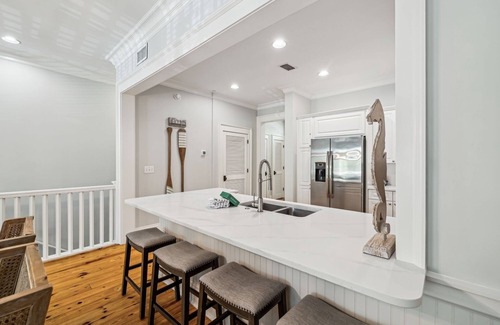The second-floor living area encompasses a living room, kitchen, and dining room all in one. The living room opens to a covered balcony offering glimpses of emerald Gulf waters and is furnished with a pair of cozy sofas (one a sleeper) and several chairs grouped around a large flat-screen TV. Up to 6 guests can dine at the glass-topped dining table, with a place for 4 more at the adjacent breakfast bar. The kitchen's crisp white cabinets also front the stainless-steel refrigerator and dishwasher and are accented with white quartz countertops. A half bath completes this level. This unit offers the best of both worlds, being just a block from the Town Center, a short walk to Seaside, and an even closer distance to the beach! It's the perfect location for those looking to stay near all of the action. Don't miss your chance to stay in the award-winning community of WaterColor and book today!