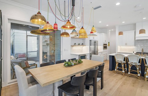 A spacious front porch with Adirondack chairs welcomes guests to this adorable home. Stepping inside, guests will find a delightfully decorated entryway with space for beach bags and towels that leads to an open kitchen, dining, and living area. Hardwood floors, white shiplap walls, and a professionally designed interior create a refined beach-chic vibe that guests will love! The kitchen features a dine-in island that seats 4 and premium appliances that include a 6-burner gas range and wine chiller. A wraparound sofa and armchair face a Smart TV that is connected to the Sonos sound system, and an adjacent dining table seats 8. Sliding glass doors open to a screened porch with a striking tiled gas fireplace, outdoor sofa, and armchair. The primary bedroom has a king bed and a private bathroom with a shower.