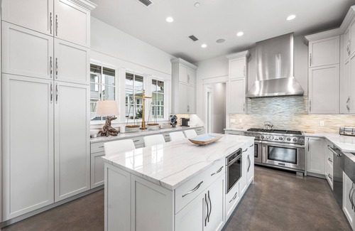 The private pool and courtyard are situated in the center of the U shape layout easily accessible from multiple areas of the home. There is a half bathroom off the main living area which is also accessible directly from the courtyard. Just outside the bathroom is an outdoor shower head. The pool is surrounded by a spacious courtyard patio perfect for lazy afternoons and has a large Artisan grill with custom hood vent and built-in prep station.