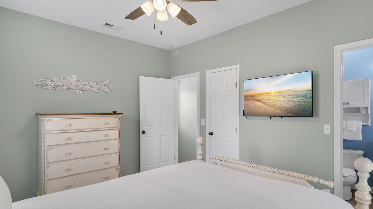 Both bedrooms, located on the second floor, offer queen beds, flat-screen TVs, and access to the shared balcony, providing a cozy retreat. Each bedroom also includes its own en suite bathroom for added privacy and convenience.