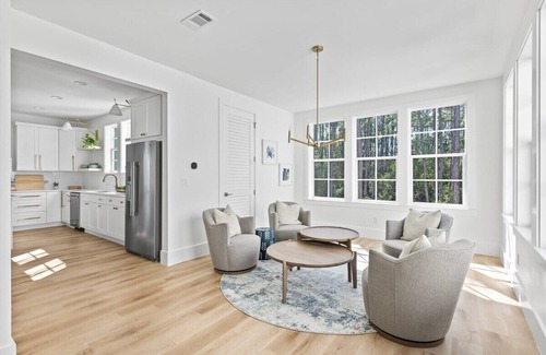 The 4-bedroom new construction home is filled with natural light and surrounded by a canopy of tall pine trees, allowing full privacy and stunning nature views to the south and to the east of the property. Watching a sunset from the dining room while enjoying a glass of wine or a lovely meal is an activity you do NOT want to miss.