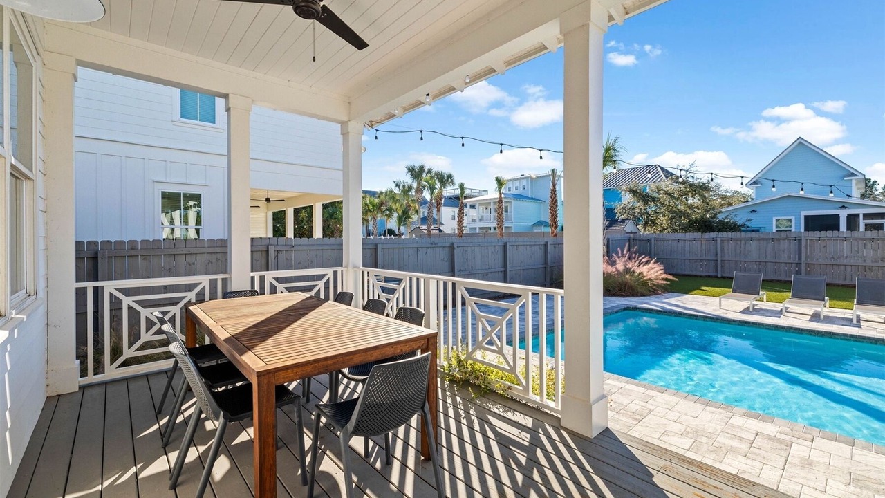 Featuring a private heated pool, outdoor shower, AstroTurf yard, beach essentials, outdoor speakers, living room with surround sound and sliding glass doors, + an open concept floor plan!