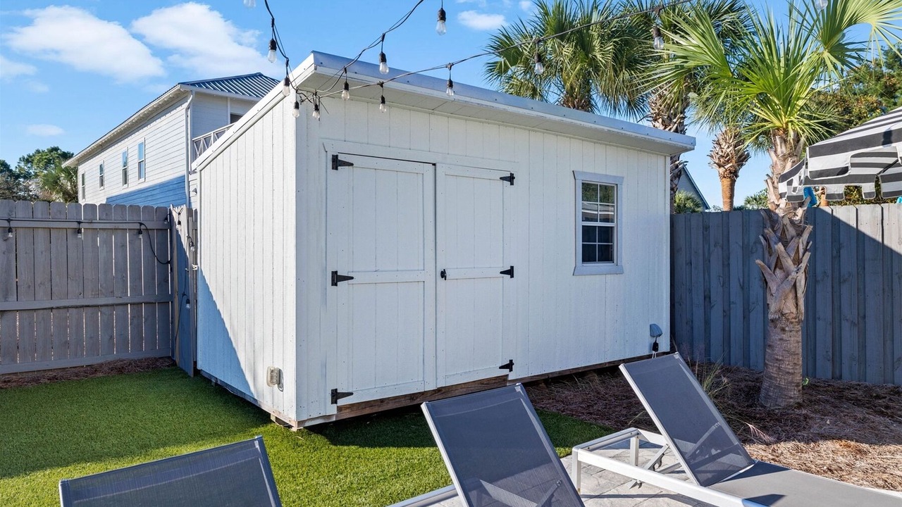 The backyard is fully equipped with an AstroTurf yard, outdoor shower, outdoor speakers with Airplay capabilities, and a shed in the backyard filled with a refrigerator and beach essentials, including 4 chairs, 2 umbrellas, and snorkeling gear!