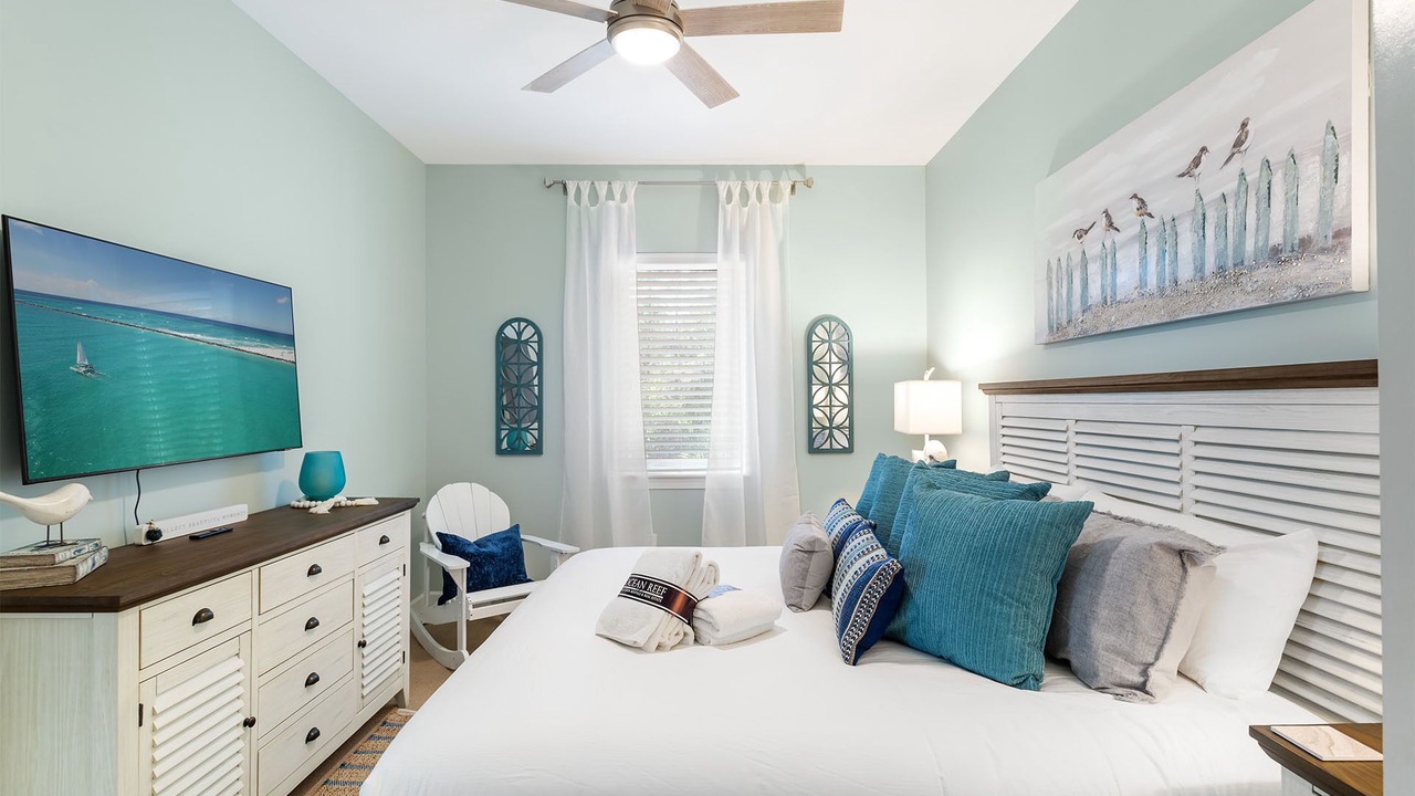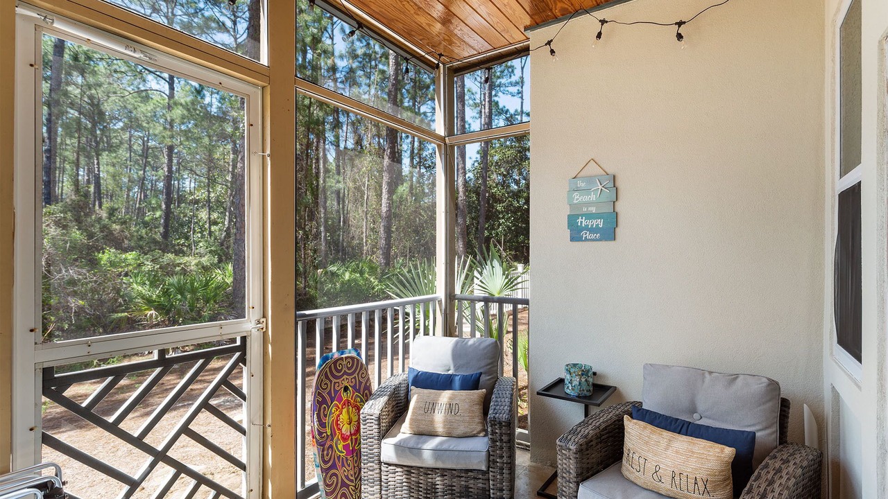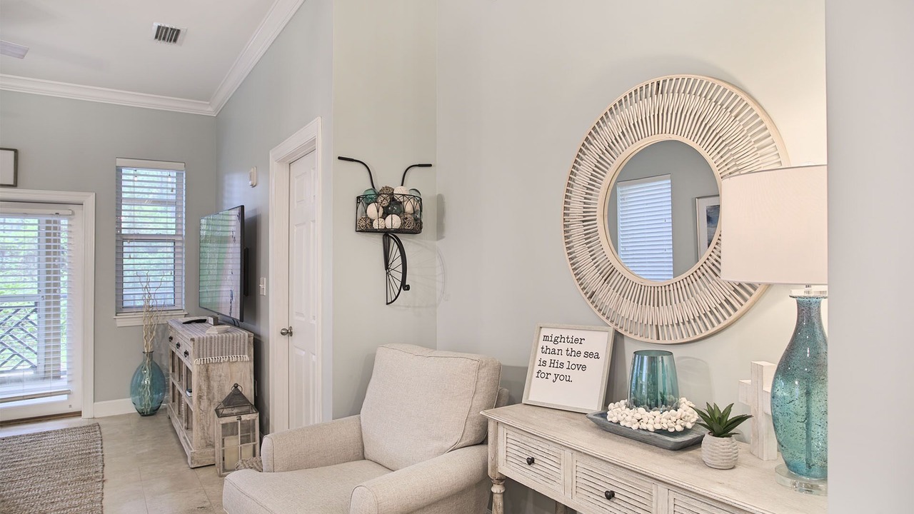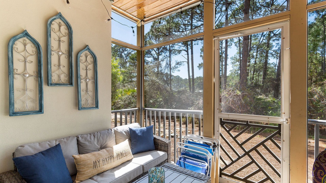 Step inside to a bright, airy living space with Palladian blue walls that create a calming, coastal atmosphere. The open-concept great room is thoughtfully designed for relaxation, with a plush, cream-colored sectional, a hardwood coffee table, and a flatscreen TV. Double glass doors lead to a screened-in porch, where you can enjoy morning coffee or evening cocktails while overlooking the lush surroundings.