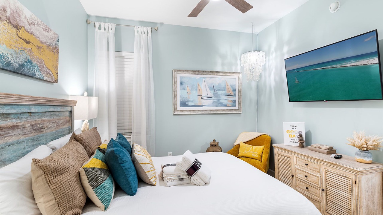 The primary suite is a serene retreat, offering a king-size bed, flatscreen TV, and an ensuite bath with dual vanities, a walk-in shower, and a soaking tub. The guest bedroom includes a queen-size bed and a wall-mounted TV, while the bunk room features a twin-over-full bunk and an additional twin bed, allowing for comfortable accommodations for larger families. A full hall bath with a tub-shower combo serves both guest rooms.
