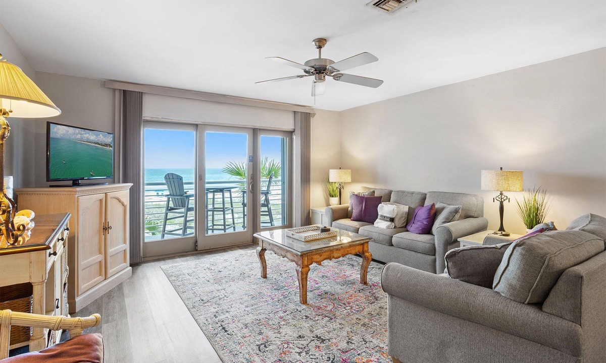 Upon stepping into this home-away-from-home, you will feel instantly relaxed in the comfortable living area. A couch, loveseat, and an accent chair make up a seating ensemble that faces both a TV and glass doors that open onto a beachfront balcony. The couch easily converts into a queen sleeper sofa for additional bedding if needed. The balcony is the perfect place to sip your favorite tropical drink, read a book, or simply enjoy the ocean breezes and coastal views. Back inside, guests will find everything they need to cook up a delicious meal in the contemporary kitchen.